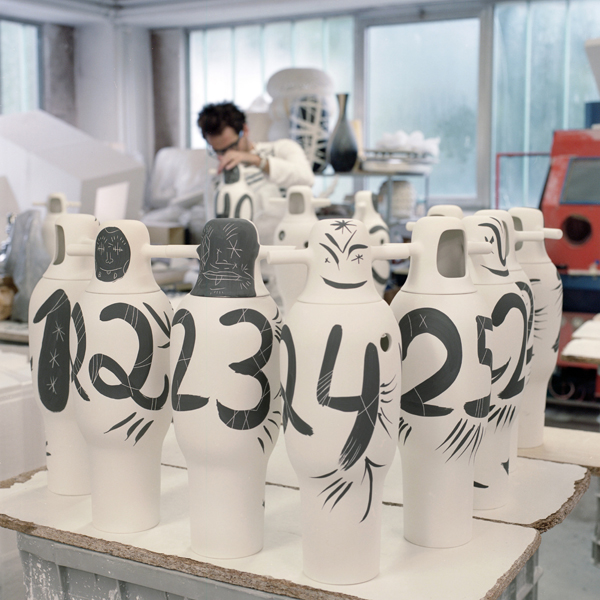 In white glazed porcelain, each vase is hand-painted by him in black enamel.