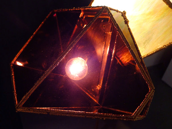 Called OverNight, the pieces are made of stained glass panels in tones of ruby, amber and mother of pearl, secured by copper strips that have been immersed in an electro plating bath. During the overnight immersion, the copper strips grow another, more jagged layer of copper, which fits tightly to the edges to create a secure frame for the panels.