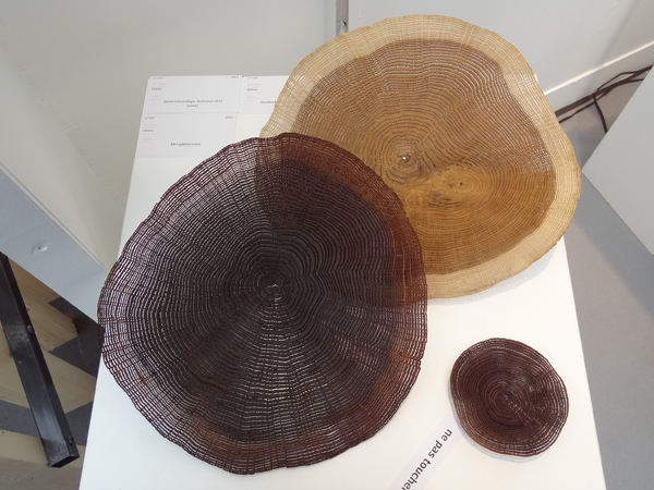 Highlights include a series of traditional tools made out of crystal; a narrative forest made out of glass and wood; chairs covered in an intricate silicon lace; colourful glass table lamps with faceted light bulbs hanging inside them; a honeycomb coffee table made of hundreds of pieces of solid wood; and a collection of decorative accessories made of the thinnest layers of hand-cut wood.